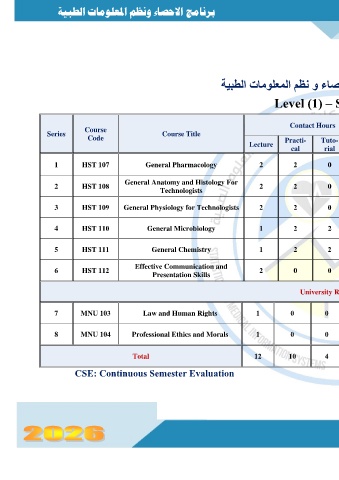 3 HST 109 General Physiology for Technologists 2 2 0 0 3 60 60 30 Registration 2 150
