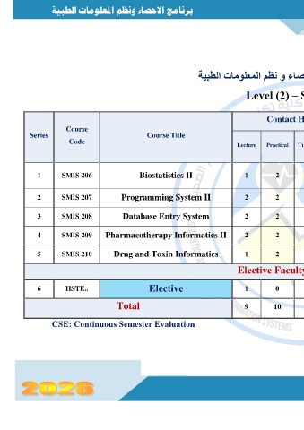 4 SMIS 209 Pharmacotherapy Informatics II 2 2 0 0 3 60 60 30 HST 107 2 150