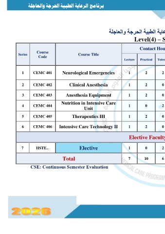 6 CEMC 406 Intensive Care Technology II 1 2 0 0 2 40 40 20 CEMC 310 1 100
